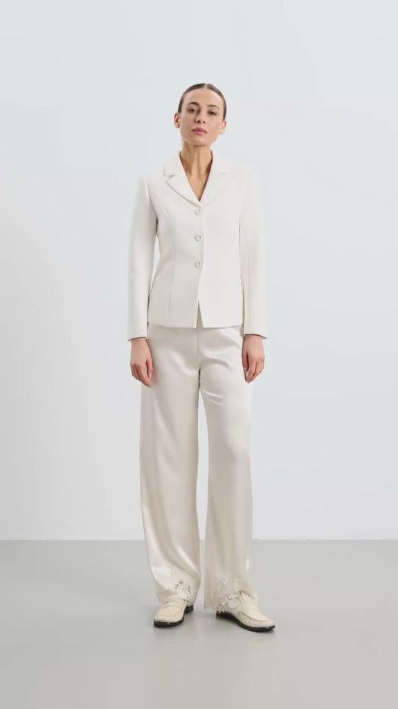 Ames Pants are designed to combine comfort with refined elegance. This updated version of the classic style features a regular fit with a luxurious satin sheen and a delicate lace trim at the hem, adding an elegant and exclusive touch to the look. Designed with a high-rise, wide-leg silhouette and an elastic waistband, the pants offer both a flattering fit and effortless ease throughout the day.
